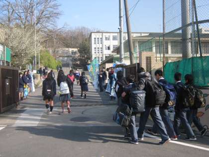 春の鳥、メジロが梅の枝に止まっていました。いよいよ春本番と言いたいところですが、まだまだ肌寒い中、生徒会による朝の挨拶運動が行われました。朝から爽やかな声を響かせてくれました。