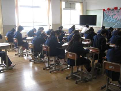 本日、1年生は中学校で初めてのテスト形式の「ジョイント・プログラム」を実施いたしました。これからの中学校の学習の目標となるものです。小学校での復習が範囲となっていました。どのクラスも、真剣に受けていました。緊張感が写真からも伝わってきます。