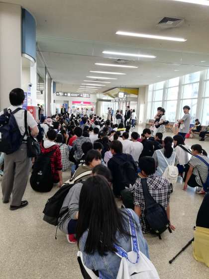 那覇空港に到着いたしました。あっという間の飛行機の旅でした。空港内は冷房が効いていますが外気は30度を超えているそうです。すごい暑さです!!