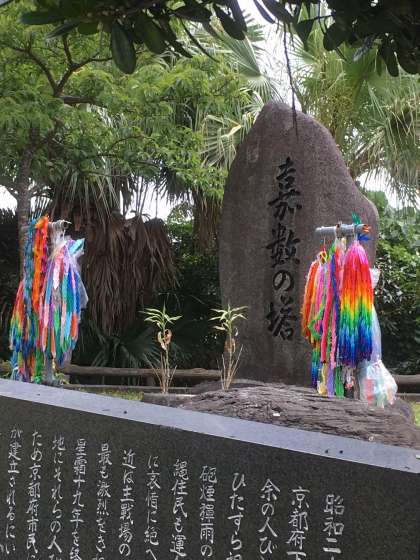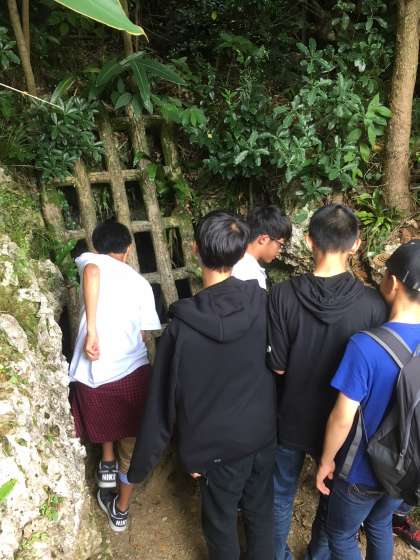 バスに移動する前に送られてきた写真を再掲いたします。衣笠中3年生が祈りを込めて折った千羽鶴です。覗き込んでいるのは戦争当時日本軍が築いた「陣地壕」です。嘉数高地には日本軍の主陣地が置かれたために、このような「陣地壕」が無数に存在しています。