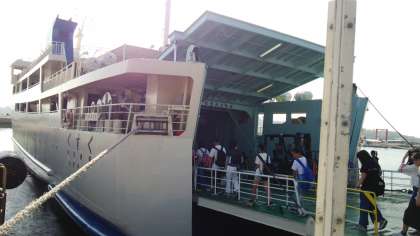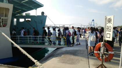 本部港に到着し、乗船手続きを終えいよいよフェリーに乗り込みます。これから伊江島に向かいます。