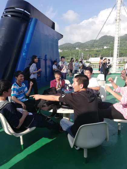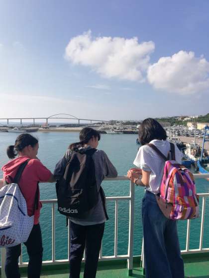 気持ちの良い青空が広がりました。船の上ではデッキでくつろぎます。沖縄の海も、空も青の色がとってもきれいです。やっと沖縄らしい景色に出会えました。間もなくも伊江島に到着いたします。30分の船旅です。