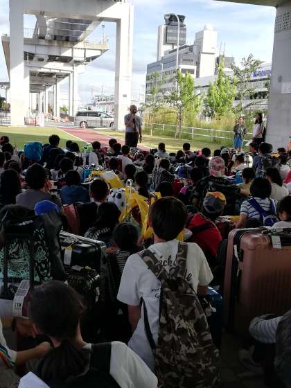 バスの乗り込む前に「解団式」です。校長先生の挨拶です。楽しい旅行ができたのは先生や旅行業者の方の力ではなく、生徒皆が少しずつ団体行動を気にしてルールを守ったからです。その中で、思いっきり楽しむことができました。いい仲間と、最高の思い出ができました。
