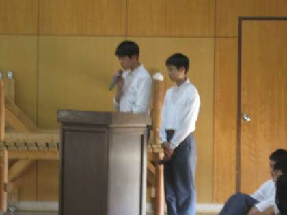 お昼休みのあとの全校集会です。放送で集合の連絡は入りません。整列も生徒会本部の指示で自分たちで整列します。全校集会では学級目標の発表とクラスで制作した学級木の発表が行われました。