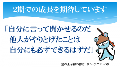 いよいよ2期がスタートしました。台風20号が心配されましたが、無事に始業式を迎えることができました。各地での被害が広がらないことを願うばかりです。