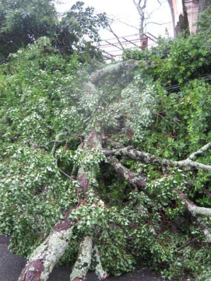 この写真は9月4日(火)5時30分ごろの台風直撃当日の写真です。暴風雨がおさまり,外へ出てみると体育館の向かいのメイン通路に道を完全にふさぐ形で,木が倒れていました。