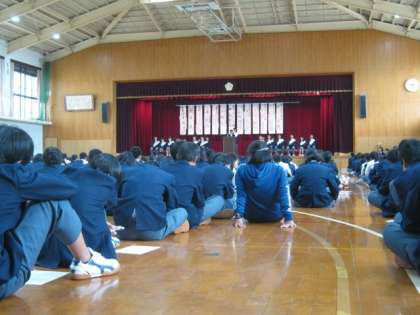 本日は生徒会の次の本部役員を生徒の投票によって決める立会演説会,選挙です。この選挙に先立って朝の選挙運動,教室で放映される政見放送そして本日までの間応援の生徒を含めた演説の練習も行ってきました。立候補者・応援者の演説のあと,教室で選挙管理委員による生徒会役員選挙投票と開票作業を行います。