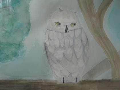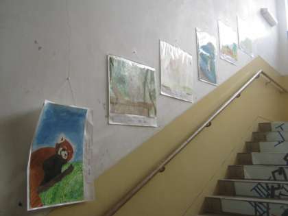 職員室の横の階段に動物の絵が描かれた作品が展示されました。この作品は美術部と数人の生徒が京都市動物園で描いた作品です。