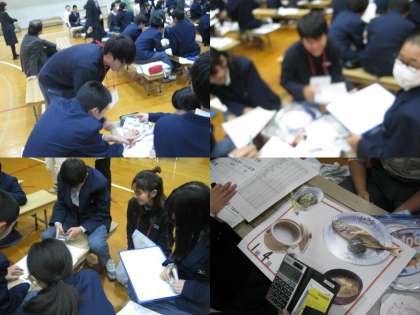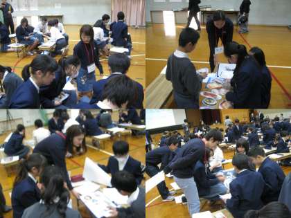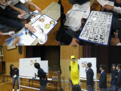 後半の演習では自分たちで栄養バランスを考えて,食事のメニューを組み合わせます。前半で学んだ「バナナ」や「野菜」を多く取り入れているところが見られました。「菓子パンだけ」や「好きなものだけ」ではバランスの悪い食事になってしまうことがわかりましたね。