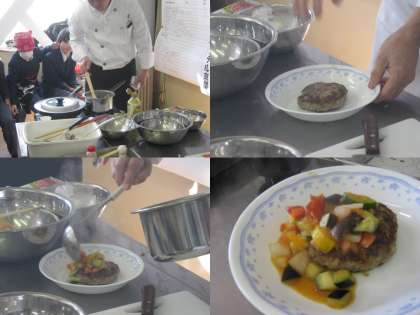 本日2年生の調理実習として司厨協会からホテルや料理店で働いておられる,本当のシェフが3名おいでになり,調理実習をおこないました。
