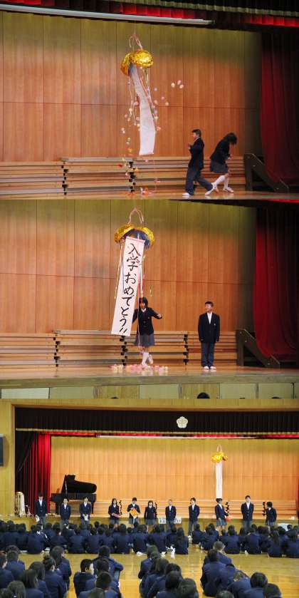 吹奏楽の演奏で入場し、生徒会代表の「歓迎の言葉」、校歌を合唱、