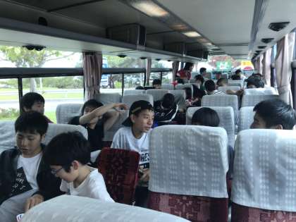 金武町へ向かうバスの中の風景です。バスの中でも元気です。曇っていても京都とは違う風景が見られて驚く場面もあります。