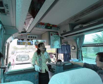 荷物を受け取り、バスに乗り換え、本部港に向かって進んでいます。