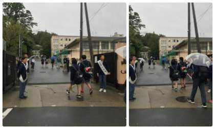 「雨の中の校門の風景」
