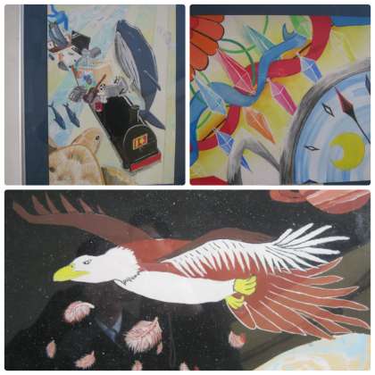 階段の壁面には素敵な絵画が展示されました。中学生のイマジネーションが思う存分発揮された素晴らしい水彩画が描かれています。水墨画もあり、お見事な表現力です。心が和みます。