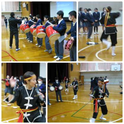 修学旅行の事前学習として講師の先生を招き,沖縄の地理・歴史・文化そして戦争のことについてのお話を聞きました。そして講演のあとはエイサーを体育館で披露していただき,太鼓を生徒が叩きました。音楽と太鼓の音で,衣笠中体育館が沖縄にいるような雰囲気になりました。