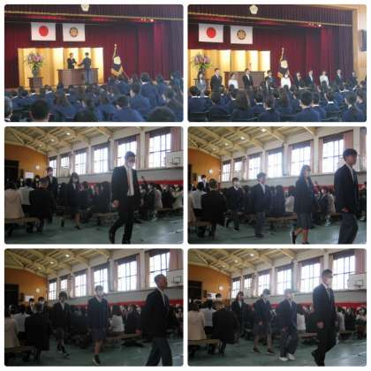 新入生のプラカードによる誘導は今年は先生方が行いました。新入生が入場し場内が華やいだ雰囲気になりました。校長先生の式辞,生徒会長の歓迎の言葉,新入生代表の決意の言葉が続き,閉式となりました。1年生担当の教職員の紹介の後に新入生は担任の先生と教室へ向かいます。