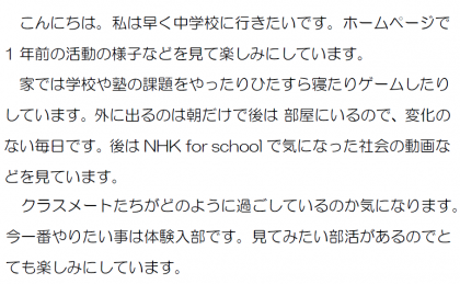生徒からのメールも届いています。新入学での学校生活を楽しみにしていたようです。家では動画コンテンツを見たりされています。送信ありがとうございました。部活動への期待と夢を語ってくれました。