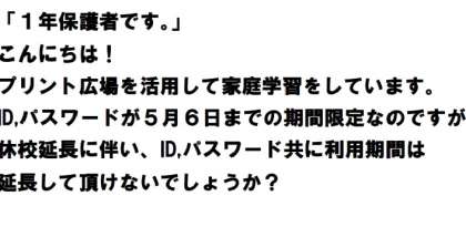 保護者の方から質問メールをいただきました。「プリントひろば」のID・パスワードは5月6日までの利用可能と書かれていますが,臨時休業の延長に伴い,5月31日まで利用が延長されています。