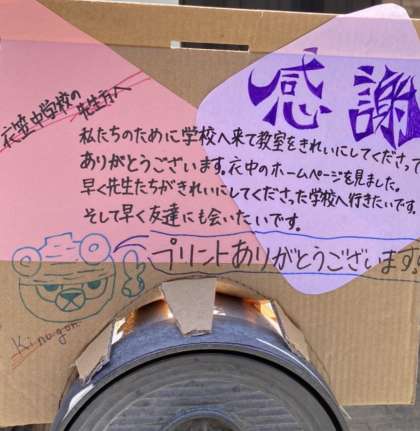 本日、プリントを配布しました。プリントをポストに入れようとした時、とてもうれしいことがありました。ポストにこんな素敵なメッセージをデコレーションしてくれていました。とても勇気をもらいました。ありがとうございます。先生たちも頑張ります。皆さんも頑張りましょう!!