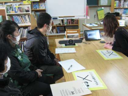 再びZOOMアプリを使った研修会です。事前に収録した授業の様子を,大学の先生に見ていただき,オンラインで講評と研究協議を行いました。今年はZOOMを使った会議が何度も行われました。本日は衣笠中と他の中学校と大学の3か所をつないで研修会を行いました。タブレットの横にある黒い機材がカメラとスピーカーで音声と映像を同時に送受信することができます。