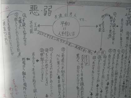 2年生「走れメロス」の生徒が作成した書込みシートが,階段に掲示されていました。本当に素晴らしい内容で,各自の書き方のレイアウトや着眼点がよくわかって,読んでいて感心しました。授業の中で「深い学び」に取り組まれている様子がよくわかりました。皆さんも階段の掲示物をぜひ読んでください。