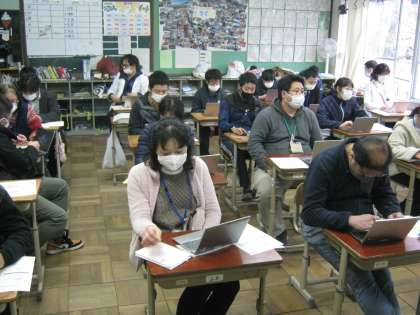 先生たちは来年度に向けて,タブレットを使用できるように研修を行っています。本日はMicrosoftのTeams/Formsというアプリを使って意見交流やアンケート用紙の作成を行いました。40人近くの先生が一度にタブレットを使うと,数台のタブレットがアプリケーションが立ち上がらないトラブルが起こりました。まだまだ完全に使いこなすのには時間と対応策が必要だということも判明しました。
