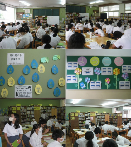 懐かしい「ぐりとぐら」の大きな絵本の読み聞かせに始まり、学校図書館の本の分類の話。ブックトークの実演などなど。生徒は、いつもと違う図書室での授業のなかで「本」を身近に感じられたのではないでしょうか。夏休みはすぐそこ、ぜひともお気に入りの一冊に出会ってほしいものです。