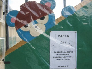 体育館前に「きぬごん板」が設置されました。生徒会協議会を中心に作製された掲示板です。生徒会新聞などを掲示していく予定です。ぜひ見て下さいね。