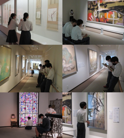 美術の授業の一環で3年生が京都府立堂本印象美術館で美術鑑賞を行いました。本日は、3年6組(2限)・4組(3限)・1組(4限)が鑑賞しました。今年度は堂本印象生誕130周年で特別企画展が行われています。彼が描いた素晴らしい作品が放つ迫力や表現力を感じ取れる充実した時間でした。