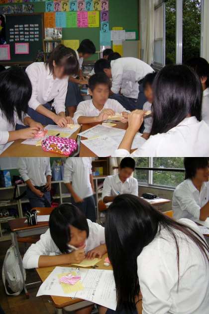 9月20日に全校生徒で、千代紙で風車飾りのぽち袋を折り・花の種を入れ、メッセージカードを書き、表紙に花の絵を色鉛筆で描きました。