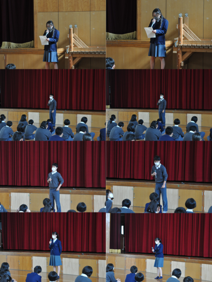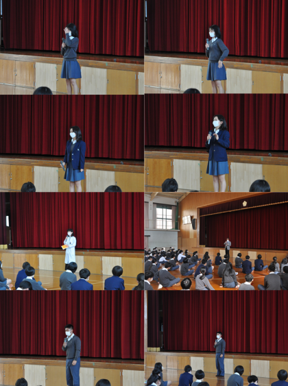 本日4限体育館で修学旅行の事前指導(結団式)が行われました。まず修学旅行実行委員長の挨拶から始まり,各部会長からの諸注意,保健室からの話,生徒指導部長の先生からの話,学年主任の先生からの話,そして最後に校長先生からの激励の言葉がありました。4月に予定されていたのが9月になり,更に明日に延期され,行き先も沖縄から高知へと変更になった修学旅行。明日いよいよ出発します。事故やけがのないようにお互いに思いやりを持って,元気に楽しい時間を過ごしてきてください!明日に向けて今日はゆっくり休んでください。