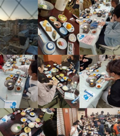 さて,本日修学旅行2日です。生徒たちは,6時に起床し,6時30分より朝食をとりました。ここでも2部屋に分かれて食事をとっています。今日は終日高知県須崎市で自然体験学習を行います。