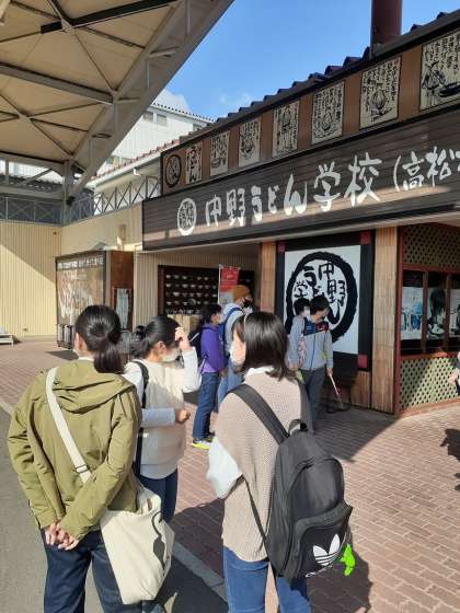 ナカノヤ高松「中野うどん学校 高松校」に到着しました。うどん打ち体験を行います。作ったうどんは,お土産となります。