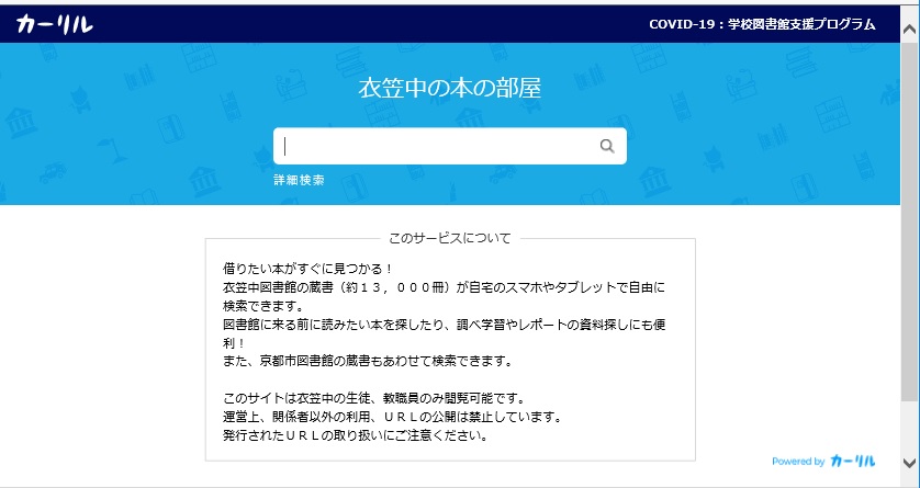12月1日(水) 「衣笠中の本の部屋」オープン 公開日 2021/12/01 更新日 2021/12/01 学校の様子 衣笠中図書館よりステキなお知らせです。 11月26日配布のプリントでお知らせしていましたが、インターネットを利用して衣笠中図書館の蔵書検索が出来るようになりました。 詳しくは「図書館だより 師走」をご参照ください。 ページの右下の「図書館だより 師走」又は以下のリンクをクリックするとご覧頂けます。ぜひご覧下さい。 図書館だより 師走 カーリル画面