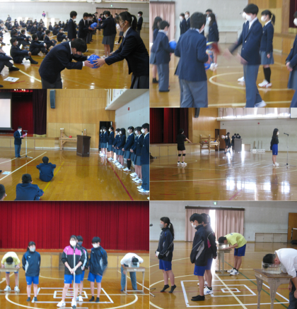 本日3限、体育館で生徒会によるオリエンテーションが行われました。1年生が対象です。生徒会が中心になって、中学校生活のことや委員会活動のこと、そしてクラスのシンボル学級旗についての説明がありました。