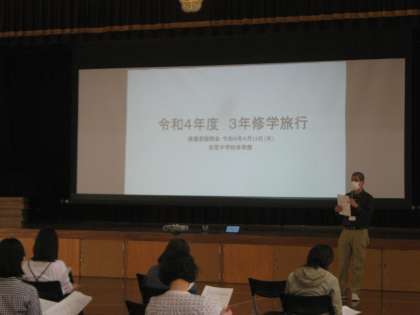 本日、6限本校体育館で3年生の保護者を対象に修学旅行説明会を行いました。暑い中、多くの保護者に出席していただきありがとうございました。欠席された方の資料は明日生徒を通じて配布いたします。