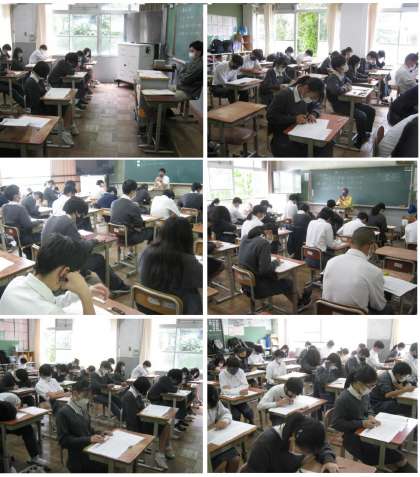 今年度,初の定期テストである「春テスト」が行われました。衣笠中学校では「春・夏・秋・冬・学年末」の年間5回の定期テストを実施いたします。学期の中間地点また学期の」まとめとしています。テストの期間に対応して計画的に学習を行ってください。写真は3年生のテストの模様です。