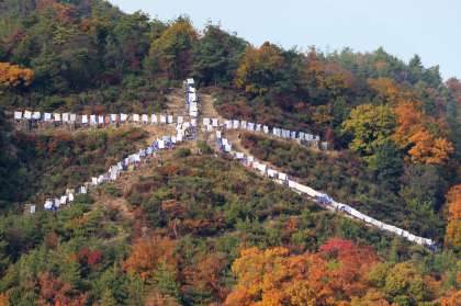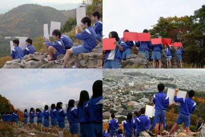 先週は体育館で人文字づくりを練習しました。今日は幸い天候に恵まれ、保護者の方にいただいた白い布と赤いパネルを持って登り、苦労の末、何とか人文字が完成しました。生徒たちにも満足感があったようです。