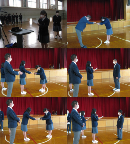次に生徒会役員退任式及び引継式が行われました。旧生徒会役員一人一人がこの1年間を振り返りました。どれも感謝の気持ちがこもっていて素晴らしい挨拶でした。