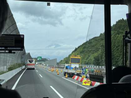 昼食を摂ったところから約一時間が経ち富士山が見えてきました。写真中央雲の合間からかすかに頂上が見えます。