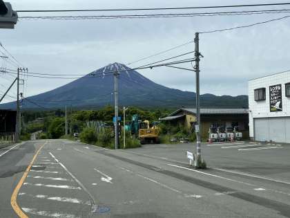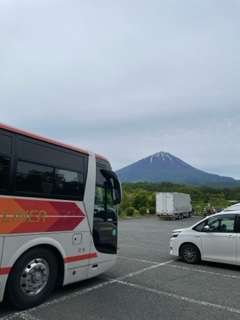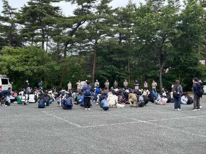 鳴沢に到着しました。洞窟探険のオリエンテーションの様子です。今日は天候に恵まれ富士山がはっきりと見えます。