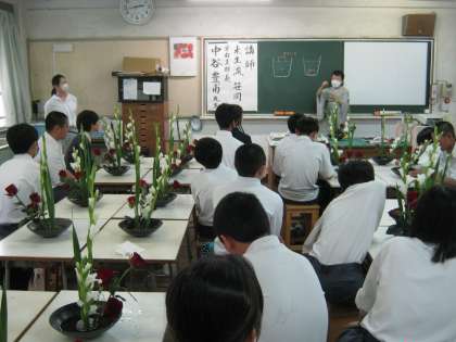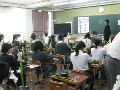 京都を発祥の地とする伝統文化の「華道・いけばな」を各流派等から講師(専門家)を招き、生徒が「ほんもの」の伝統文化を体験することを通して、伝統文化のよさ、所作、心遣い、道具を大切に扱う心、草木の生命・風興などを学び、豊かな感性や創造性等の涵養を図るとともに、生活文化としての定着とその振興・継承を図り、担い手を育むことを目的として本校2年生でいけばなを実施しました。