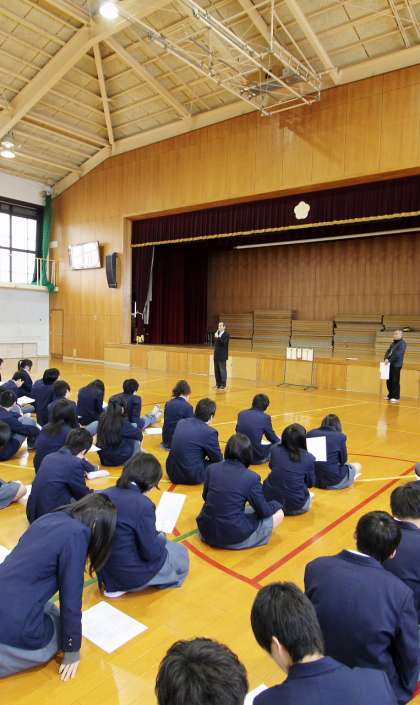 4限に体育館で受検に行く3年生を集め、激励会がありました。