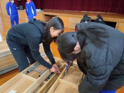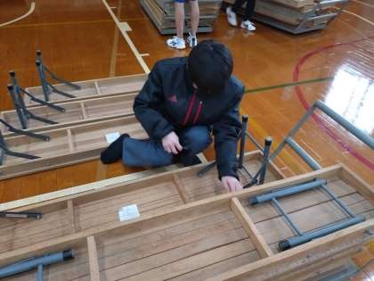 本日事業所がお休みの生徒が衣笠中学校の体育館で長椅子の補修作業をしてくれました。