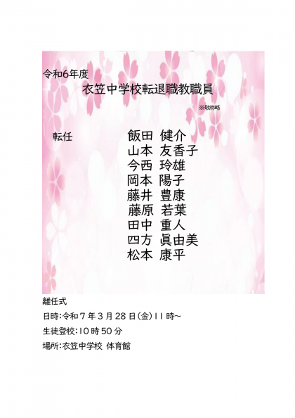 令和6年度 衣笠中学校転退職教職員