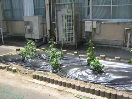 育成学級では、夏野菜を育てています。今回は、ネットの取り付け作業をしています。収穫が楽しみです。