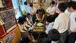 月島にてもんじゃ焼き調理中、お店の方から説明を聞いています。