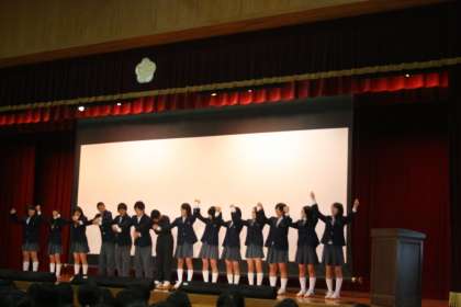 修学旅行のまとめを、劇や歌を交えて発表しました。