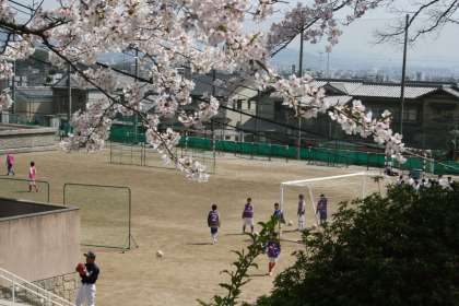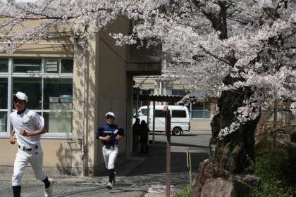 満開の桜のもとで部活動に汗を流す生徒たち。